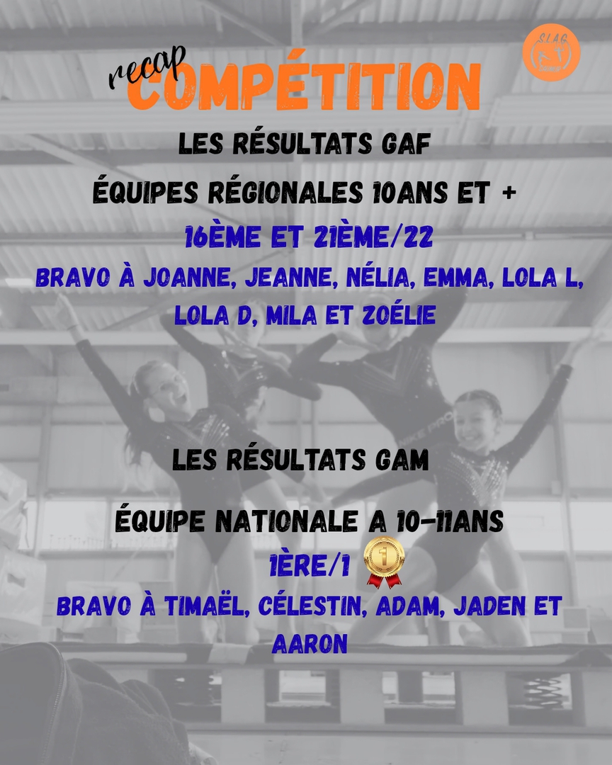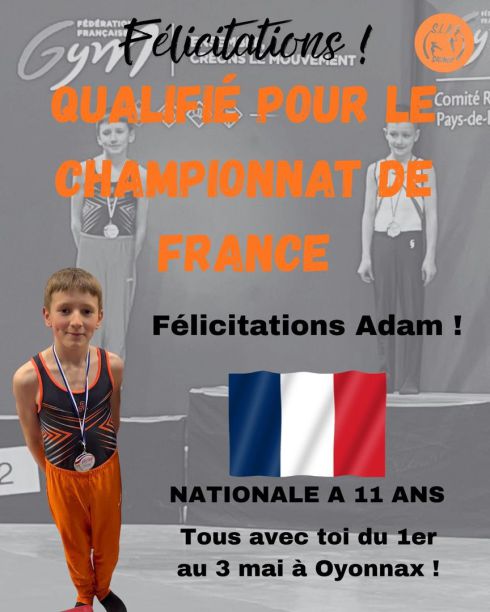 Deux bonnes nouvelles arrivées ces derniers jours : la qualification d'Adam en championnat de France en catégorie Nationale A 11 ans et la qualification en championnat de France de notre équipe Teamgym Fédérale B