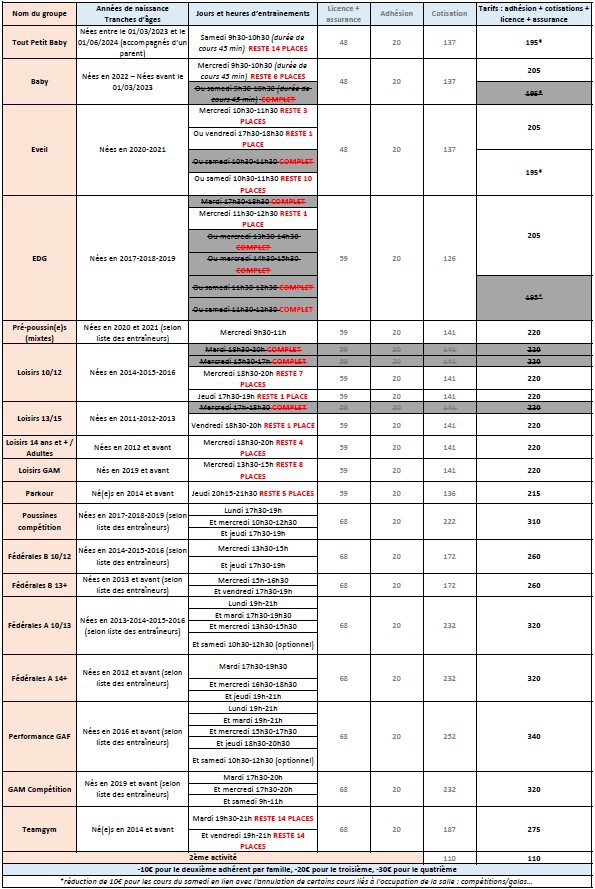 La reprise des cours se fera, pour les groupes compétitions, le 1er septembre